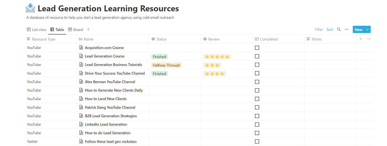 A lead generation resource database built manually using Notion.This provides three different views: list view, table, & board, and is organized by resource type.NOTION DATABASEMAKERPAD CERTIFICATE