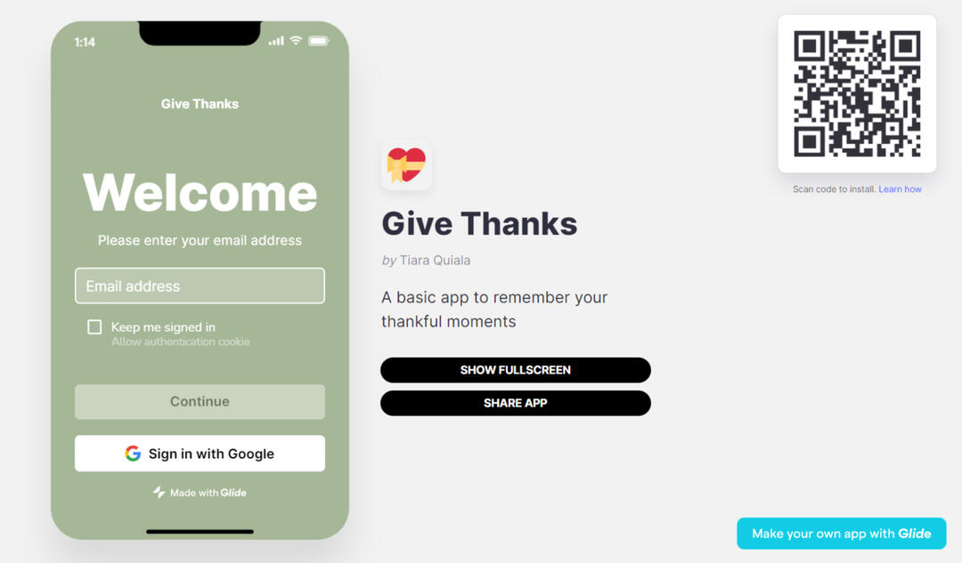 Built on Glide, Tiara created a simple app for tracking thankful moments.The app, Give Thanks, helps you track your daily moments of thanks along with monthly stats to see your past accomplishments.MOBILE APPMAKERPAD CERTIFICATE